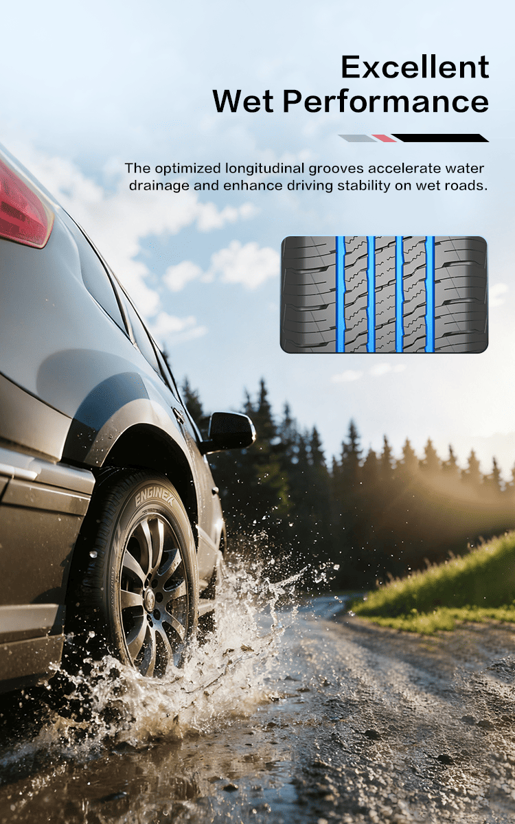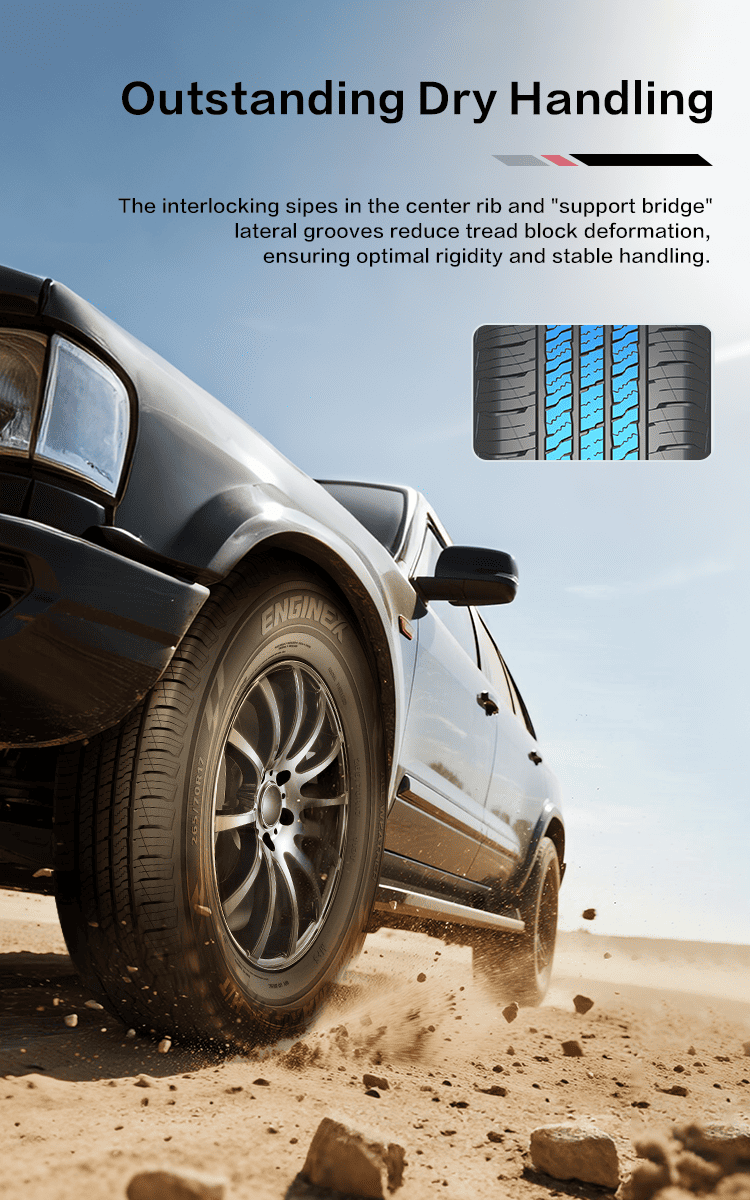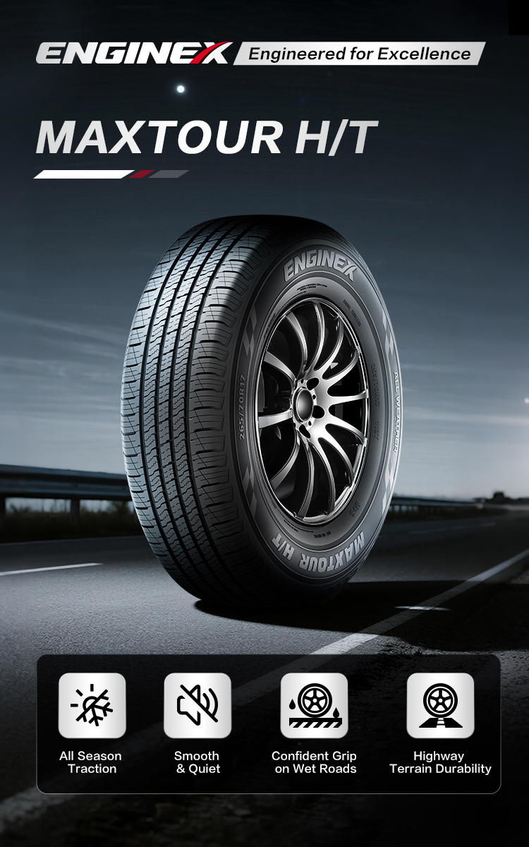 The EngineX MaxTour H/T is a Highway Terrain All Season tire designed specifically for SUVs and light trucks. It delivers a quiet and comfortable driving experience, while offering excellent handling performance on both dry and wet roads. Whether you're navigating daily city commutes or heading out on long-distance journeys, the MaxTour H/T ensures stable, reliable performance—making every drive smoother and more confident.