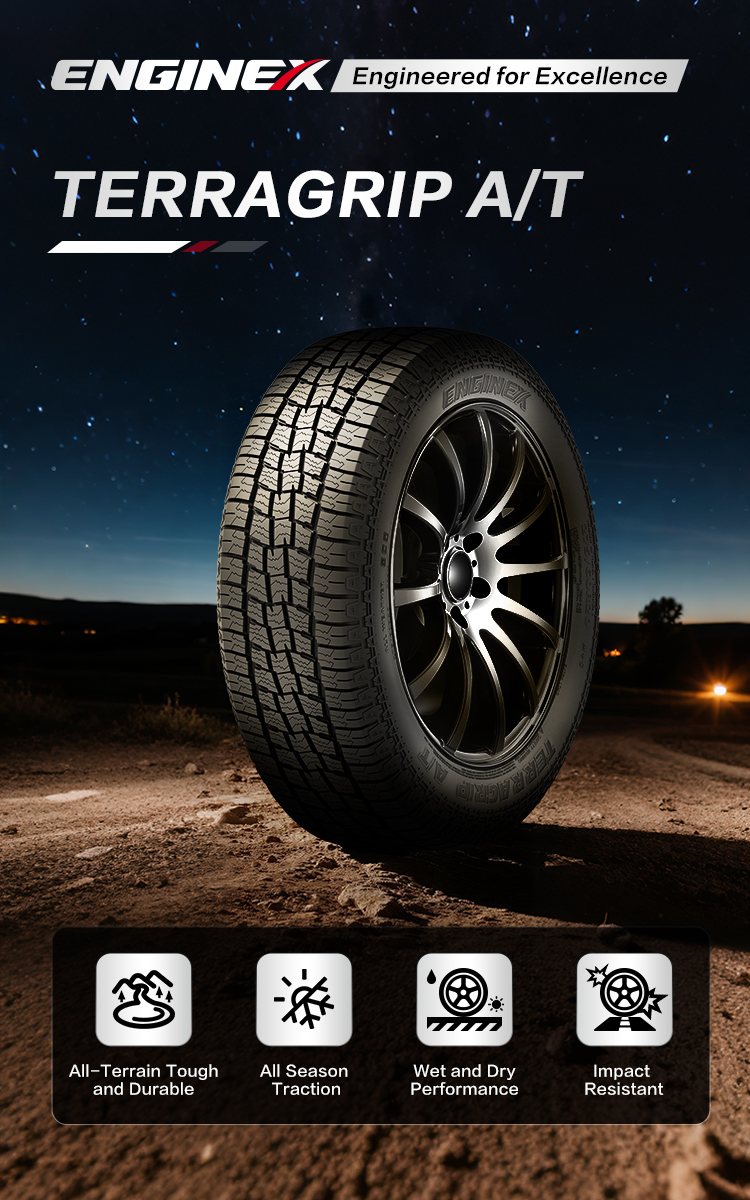 The EngineX TerraGrip A/T is an All Terrain tire designed for SUVs and light trucks.