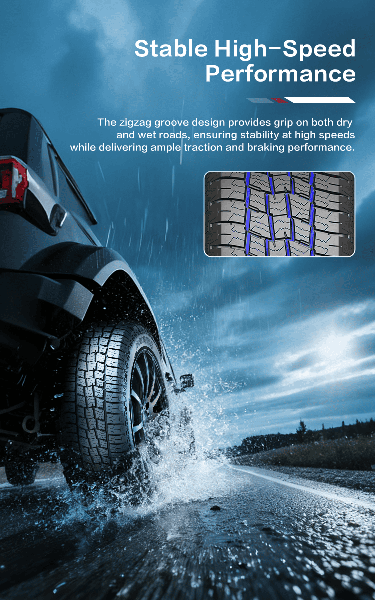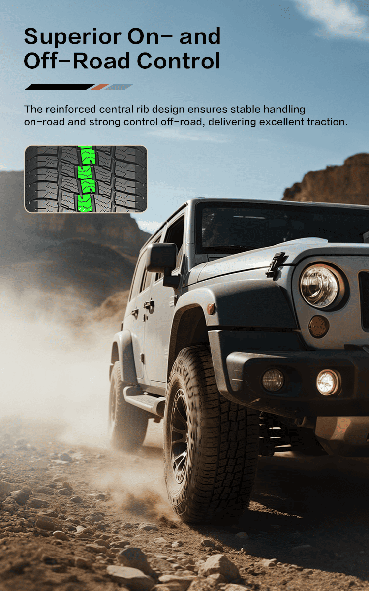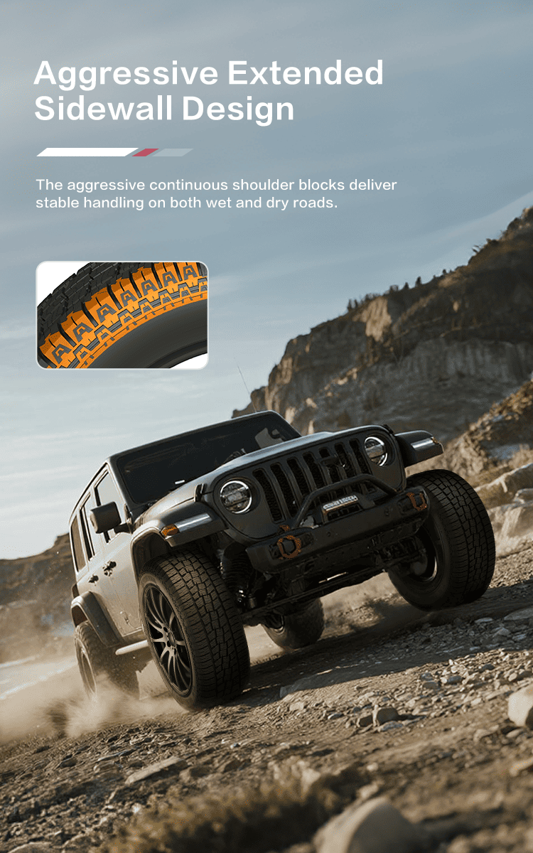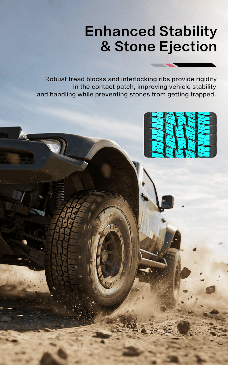 Built for versatility, it delivers strong traction across both on-road and off-road conditions. Its reinforced tread construction enhances driving stability and provides excellent resistance against cuts and impacts.Whether it’s rugged mountain roads, muddy trails, or city streets, the TerraGrip A/T delivers strong traction and reliable handling—making it the ideal choice for off-road adventures.